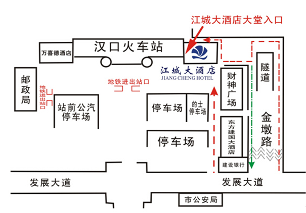 武汉市江城大酒店(小车沿下图右侧红线进停车场)。