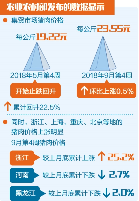 农业农村部发布的数据显示,集贸市场生猪价格从2018年5月第3周每公斤10.35元开始止跌回升,8月第3周价格达到每公斤13.60元,第4周则回落至每公斤13.56元,之后继续回升。从9月第2周开始连续3周保持平稳,9月份第4周环比涨0.1%,达到每公斤14.20元,累计回升37.2%。同时,浙江、上海、北京、重庆、福建生猪价格上涨明显,9月第4周生猪价格较上月底分别累计上涨31.0%、16.5%、13.4%、13.1%和11.7%。河南、辽宁和吉林则分别累计下跌13.1%、5.1%和5.2%。