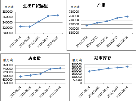 2017年全球谷物市场供应充足,多数国家产量高于近年平均值,甚至达到创纪录的高点,加上庞大的库存体量,导致供需宽松。粗粮产量达创纪录水平,主要源于南美地区和南部非洲的产量提升。小麦产量比去年略有下调,下跌趋势从2016年开始,主要原因是美国和澳大利亚减产。2018年预计小麦和玉米会有轻微减产。2017/2018年度,谷物利用量比去年上升1%,其中,食用量、种用量和工业用量分别上升1.3%、0.4%、1.2%。世界市场贸易总量与2016/2017年基本持平,总体价格波动较小,但优质小麦供给收紧,大米需求活跃,导致这两种产品出口价格更加坚挺。阿根廷豆粕受天气持续干燥的影响产量远低于预测,价格得到支撑。