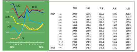 受经济的提振作用影响,全球大宗商品需求稳步增长,部分大宗产品国际价格回升。截至2018年1月,粮油、大米、小麦的国际价格指数同比分别增长0.3%、14.6%、7.8%。长期看,尽管全球经济发展向好,但谷物和油籽等主要农产品库存庞大,且国际形势复杂多变,农产品市场继续保持供需宽松格局,价格仍将在相对低位小幅波动。