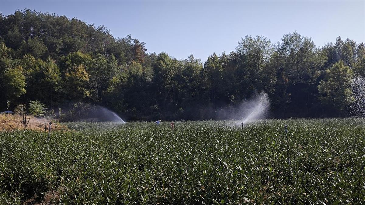 初冬早晨,阳光照射在大别山南麓上,洒在了劳作的村民们的身上,在武汉市新洲区旧街街利河村的家庭农场生态茶园里,几个自动洒水器在农田里逆时针旋转洒水,成群的土鸡在地上活动。而所谓的“农田”,其实是穿上绿衣的“荒地”,地里种的不是果蔬,而是茶树。