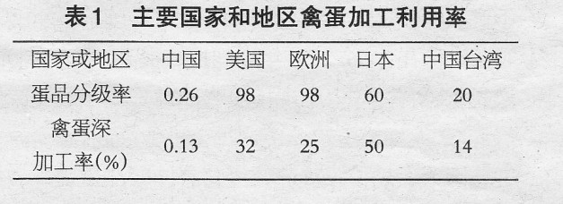 中国的现代蛋品加工业起步较晚,统计表明,鸡蛋主要以国内鲜蛋消费为主,而鸡蛋分级和加工利用率均不足1%蛋品加工企业虽然有1700多家,但大型生产加工类企业较少,且经营规模很小,区域间的蛋品加工能力十分不平衡,与西方发达国家的差距较大,见表2。