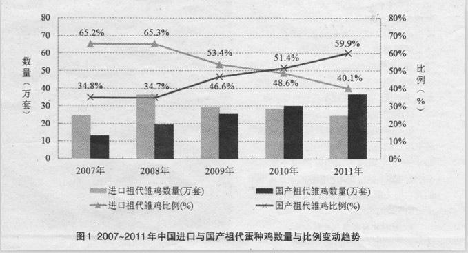 据农业部监测统计估算,2011年祖代蛋种鸡场19家,祖代蛋鸡存栏40万套左右,年可供父母代接近2000套,商品代蛋鸡存栏约15亿只,其中产蛋鸡12亿只左右,各项指标均居于世界首位。近年来进口与国产祖代蛋种鸡数量与比例变化见图1。