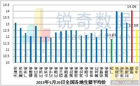 5月20日生猪市场行情与昨日上扬,全国生猪价格最高地区为新疆省,生猪平均价为14.06元/千克,最低地区为广西省,生猪平均价为11.85元/千克,两地区差异非常明显,全国大部分地区生猪行情震荡调整。