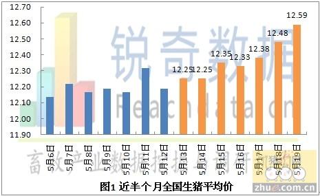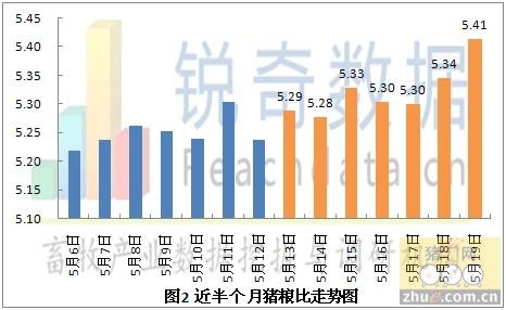 据锐奇数据监测的当地生猪报价信息统计,2013年05月20日全国各省生猪平均价格为12.59元/千克,较昨日上涨0.11元/千克,涨幅为0.88%,较上周同期(5月13日)上涨0.40,涨幅为3.28%(见图1)。今日猪粮比为5.41:1,较昨日上涨0.07,涨幅为1.29%,较上周同期(5月13日)上涨0.18,涨幅为3.36%(见图2)。