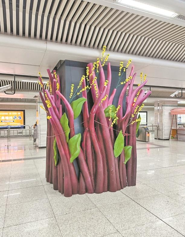 只见在武汉地铁6号线唐家墩地铁站的站厅里,硕大的一捆“超级洪山菜薹”出现在立柱上,吸引了众多市民乘客驻足打卡。在唐家墩附近上班,经常在这里进出站的市民王女士说,前一天看到站厅里的洪山菜薹就觉得特别惊叹,“洪山菜薹是武汉的特色地标农产品,在地铁里以这样有意思的方式亮相,可以吸引大家的眼球,是一种蛮好的推广方式。”