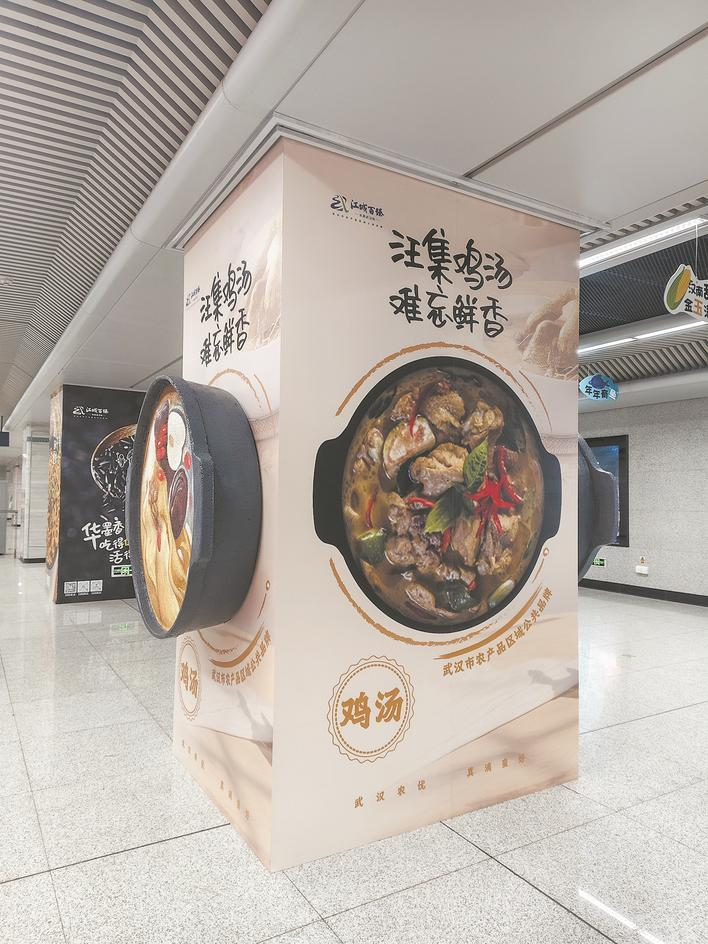 地铁站里的“超级洪山菜薹”来自哪里?“江城百臻”公司相关负责人介绍,这是武汉在岁末年初、农历春节即将到来之时,专门通过在地铁里推出农产品特殊造型,向全国人民推介江城百臻农产品。之所以做成巨型菜薹造型,把地铁柱子包住,就是想引起市民的关注,“因为菜薹本来就是一捆一捆包着的,我们用这种创意把大家喜闻乐见的农产品立体化地展示出来。”除了“巨型菜薹”,还有特色美食——汪集鸡汤。在唐家墩地铁站内,巨型的鸡汤罐子被挂在了柱子上。