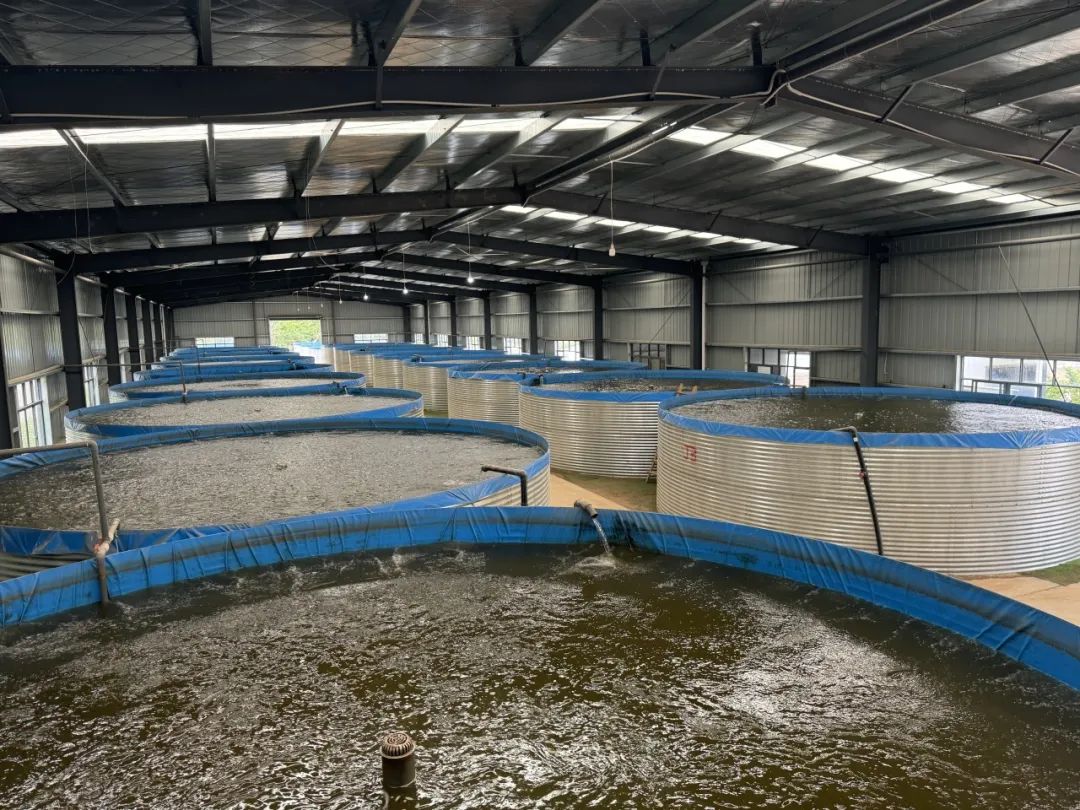 在企业的水产养殖基地,进入其中一间厂房,20余个巨型陆基圈养桶整齐排列,每个直径8米、高2米的铝锌板池内都铺设着蓝色防渗帆布。工作人员驾驶运料升降车穿梭其间,实时监测鲈鱼生长状况并精准投喂。这种新型养殖模式单池年产量高达8000-10000斤,较传统水面养殖效益提升15倍。